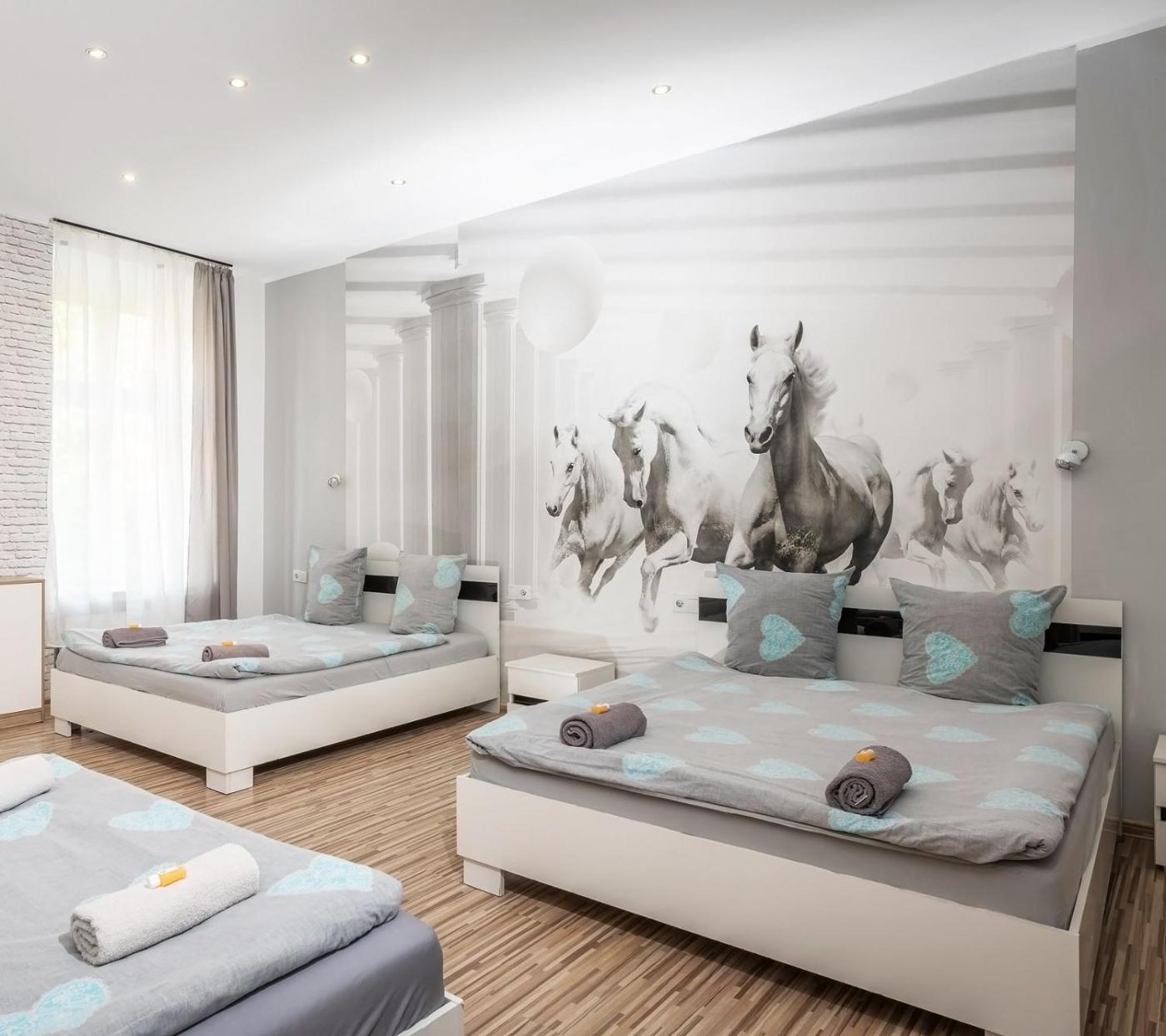 Pokój czteroosobowy typu Deluxe. Jest to pokój czteroosobowy z prywatnym wejściem, dźwiękoszczelnymi ścianami oraz prywatną łazienką z prysznicem typu walk-in i suszarką do włosów. Jest to pokój czteroosobowy z widokiem na miasto, wyłożoną wykładziną podłogą, zestawem do parzenia kawy i herbaty oraz szafą. Pokój Czteroosobowy - 4 osobowy. Powierzchnia pokoju ok.: 35 mkw. ;