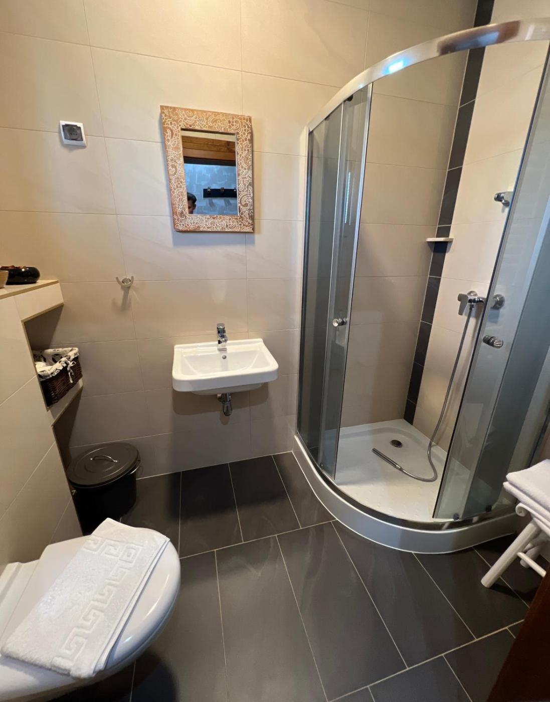 Pokój Trzyosobowy z prywatną łazienką. The triple room provides a private entrance, a wardrobe, a terrace with garden views as well as a private bathroom featuring a shower. The unit offers 2 beds. Pokój Trzyosobowy - 3 osobowy. Powierzchnia pokoju ok.: 27 mkw.