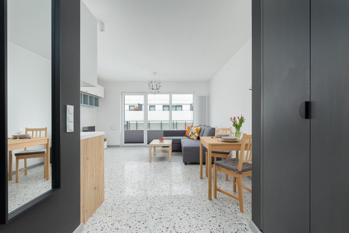 Studio z balkonem. Offering free toiletries, this studio includes a private bathroom with a shower and a hairdryer. Meals can be prepared in the kitchenette, which is fitted with a stovetop, a refrigerator, a dishwasher and kitchenware. This studio features a washing machine, a private entrance, a flat-screen TV with satellite channels and a balcony. The unit offers 1 bed. Studio - 2 osobowy. Powierzchnia pokoju ok.: 30 mkw.